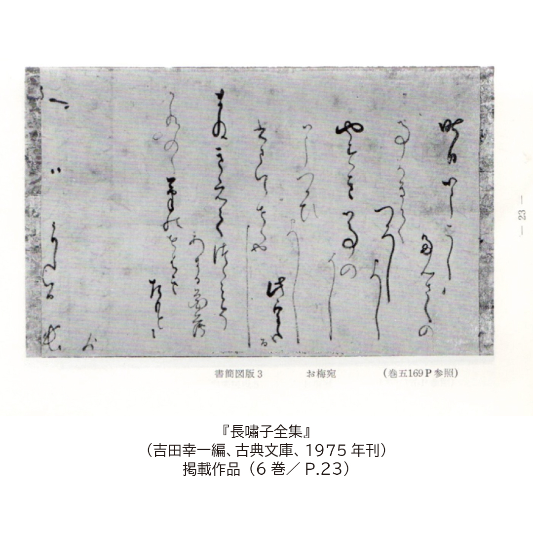 ・『長嘯子全集』(吉田幸一編、古典文庫、1975年刊)掲載作品(1巻/No.1191、5巻/P.160・P.169、6巻/P.23に図版)
