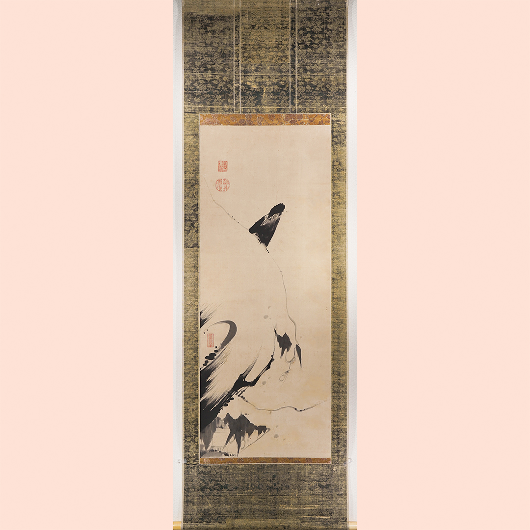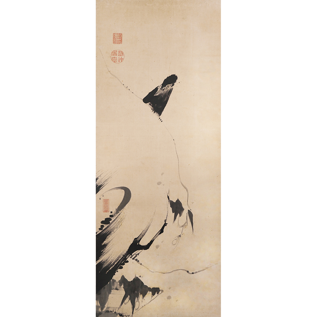 若冲は、それまでの日本の絵画にない奇抜なモチーフ、独特な画面構成により、奇想の画家として、また江戸美術を代表する画家の一人としてよく知られています。名は汝釣、字は景和。斗米庵、米斗翁、心遠館、錦街居士などと号しました。京都錦小路の青物問屋「枡屋」の長男として生まれ、数え年で23才の時に父親の死去に伴い家業を継ぎます。その後、40才の時に弟、白歳(はくさい)に家督を譲り、絵画制作に没頭。